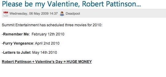 tenemos la fecha de estreno de la nueva pelicula que rob hara que saldra para la fecha de SAn Valentin,Febrero 12 del 2010!